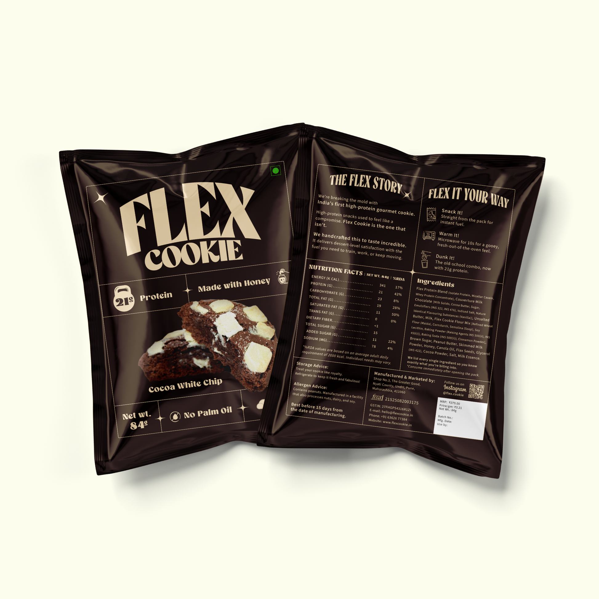 Flex Protein Blend (Isolate Protein, Micellar Casein, Whey Protein Concentrate), Couverture Milk Chocolate [Milk Solids, Cocoa Butter, Sugar, Emulsifiers (INS 322, INS 476), Iodised Salt & Nature-Identical Flavouring Substances (Vanilla)], Unsalted Butter, Milk, Flex Cookie Flour Mix [Refined Wheat Flour (Maida), Cornstarch, Semolina (Sooji), Soy Lecithin, Baking Powder (Raising Agents INS 500(ii), INS 450(i)), Baking Soda (INS 500(ii)), Cinnamon Powder], Brown Sugar, Peanut Butter,Skimmed Milk Powder, Honey, Canola Oil, Flax Seeds, Glycerol (INS 422), Cocoa Powder, Salt, Milk Essence